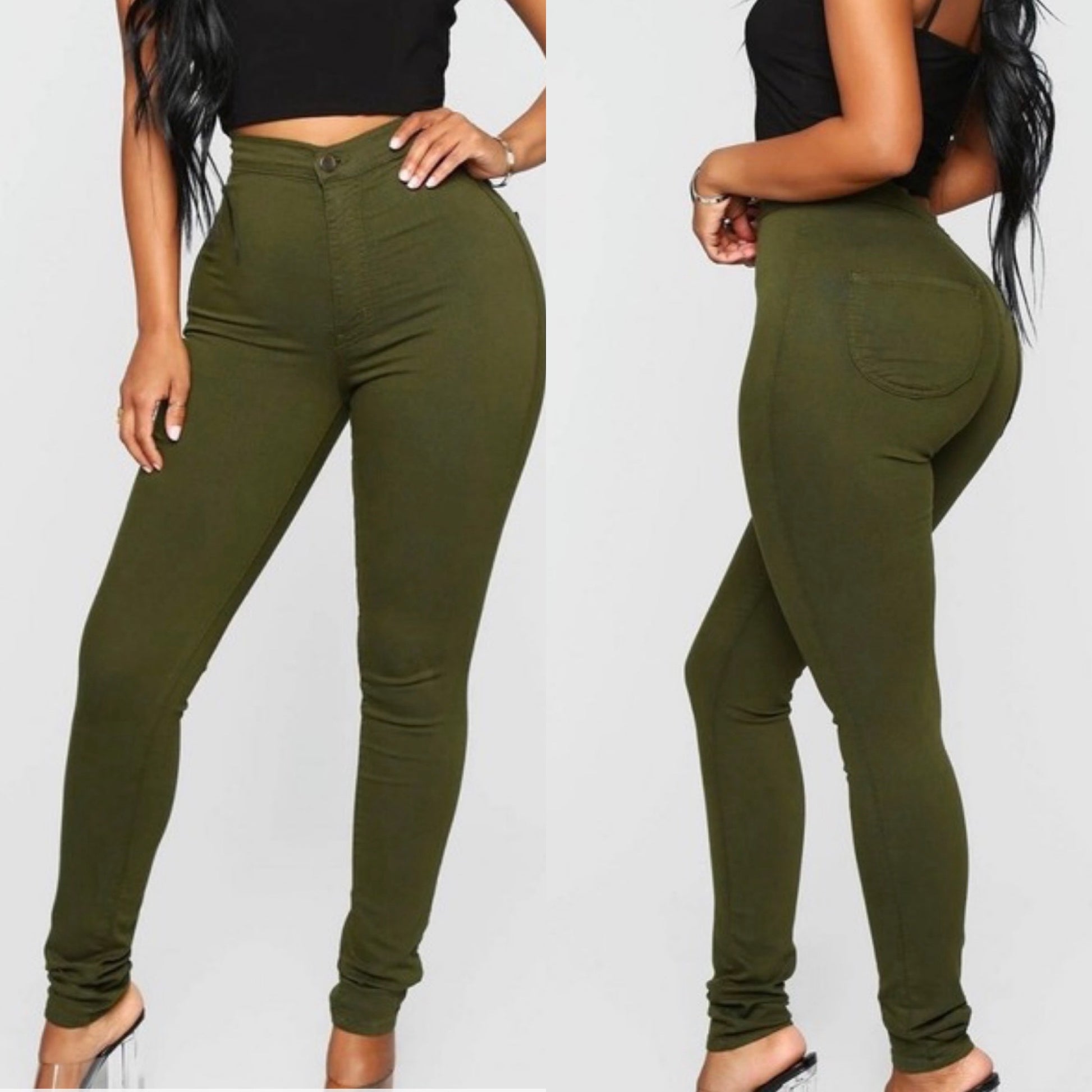 - High waisted stretch jeans.